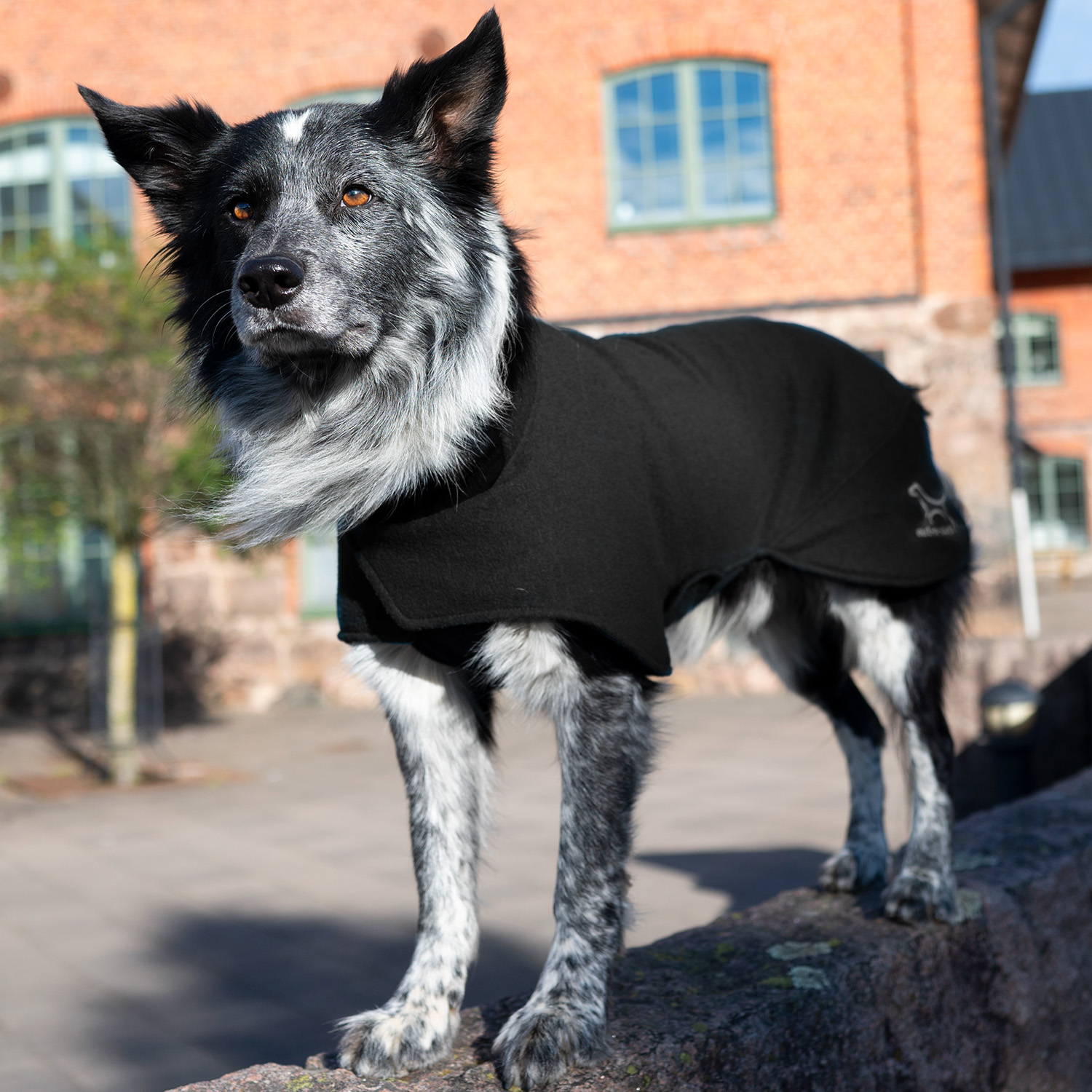 Ett dubbelt ulltäcke fodrat med 100% ull. Ett varmt hundtäcke som ger maximal omsorg och värmer din hund kyliga dagar. Yttertyget är tillverkat av 75% ull och har en tät utsida som skyddar mot vind och en ruggad insidan som bildar ett luftlager ihop med fodret som håller mycket god värme. Enkelt att ta av och på. Detaljer i Power stretch möjliggör bästa tänkbara rörelser och högsta komfort. Bensnören ingår. Storleken anger måttet från skuldra till svansrot. Yttertyg: Valkad sportmix av 75%Ull 25%PL (Tillverkat i Italien) Foder: 100%Ull (Tillverkat i Italien) Täcket är tillverkat i Sverige. Går att tvätta i Maskin (Ulltvätt) 30 grader. Färg: Svart.