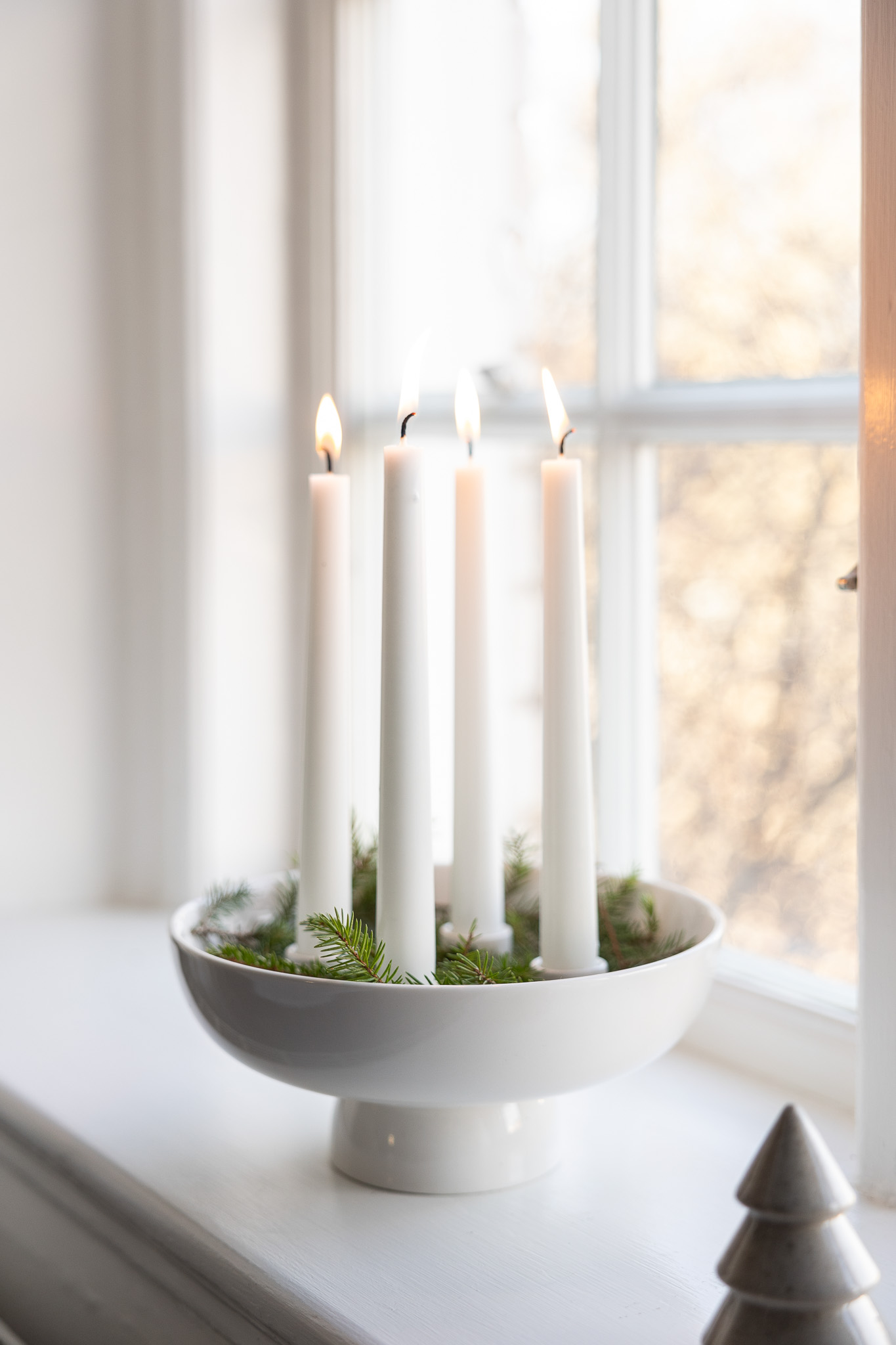Ljusstake på fot i glaserad keramik. Så fin att dekorera efter säsong som adventsljusstake med t.ex. kottar, mossa eller polkagrisar till jul för att skapa en härlig julkänsla. På sommaren kan den dekoreras med snäckor, endast fantasin sätter gränser. Avsedd för kronljus.Material: KeramikFärg: VitB: 21 cm H: 9 cm