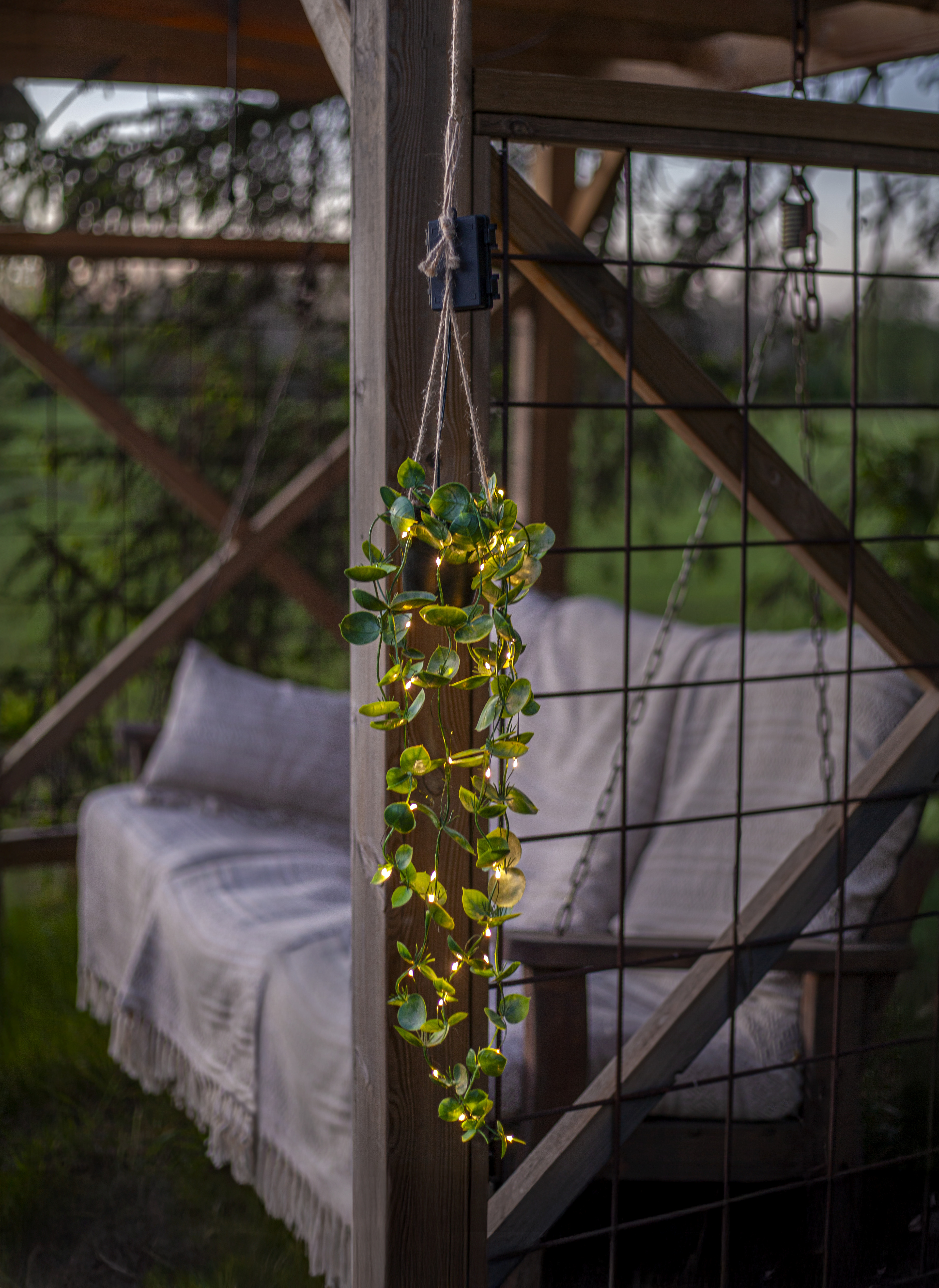 Dekorativ konstväxt/ampel med dew drop slinga, 35 varmvita ljuspunkter ger ett fint sken. Perfekt grönska för hemmets lite mörkare vrår, passar även utomhus då batteridosan är tillämpad för utebruk. Svart plastkruka med juterep för enkel placering, hängande eller stående.FärgGrönAnslutningskabelns färgSvartProduktkabelns färgGrönLjusfärgVarmvitBredd/längd (cm)10,00Höjd (cm)60,00Djup (cm)10,00AnvändningsområdeUtomhusLjuskällor35Ljuskälla ingårJaTyp av ljuskällaLEDSockelEj utbytbarBatteriinformation3 batterier AA ingår ej. Brinntid ca. 80h.Timer6 h på, 18 h av, repeterandeStrömbrytareIntegreradTotal effekt (W)0,34Spänning4,5V DCAnslutningskabelns längd (cm)100Anslutningskabel-specifikationPVC kabelAvstånd mellan lampor (cm)10IP-klassIP20Gran-konstruktionPush-inAntal sektioner1
