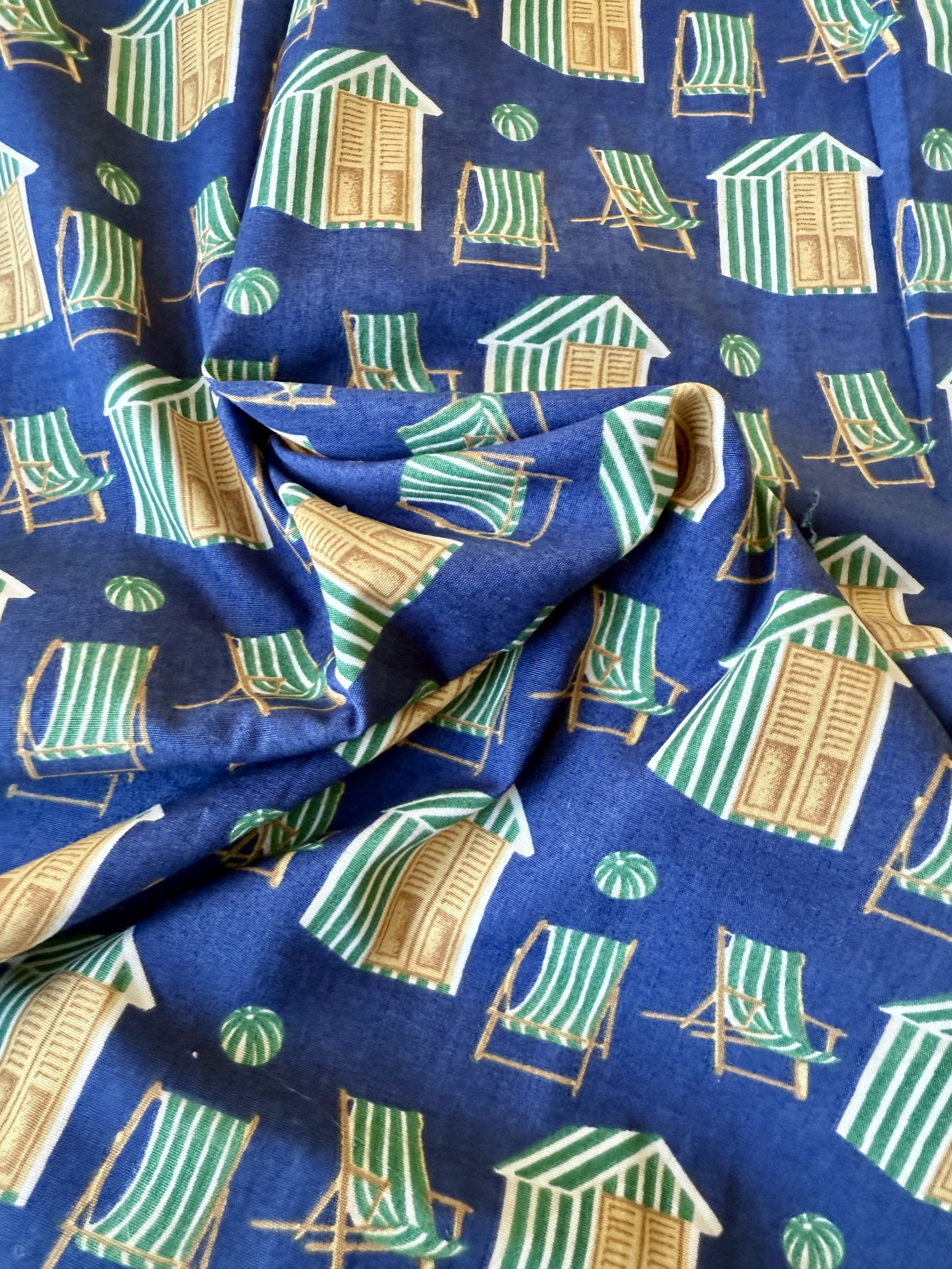 Vintagetyg - bomullstyg med roligt mönster - stor bit! Bredd 150 cm och längd 2,55 m. Läs mer!Vintagetyg. Härligt tygtryck med solstolar, badhytter och badbollar på mörkblå botten. Finns några små revor nära kanterna som troligen uppstått vid tillverkningen (det fanns etikett från fransk fabrik) som alla är utmärkta med tejp (avigsidan) så att du kan undvika dem vid klippning. Annars fräscht och helt nytt tyg.Priset är för hela biten, nedsatt p g av revorna.Kvalitet: 100% bomullBredd: 150 cm.Längd: 2,55 meterTidsperiod: Troligen 00-tal. Skick: Perfekt, förutom ovan nämnda revor.
