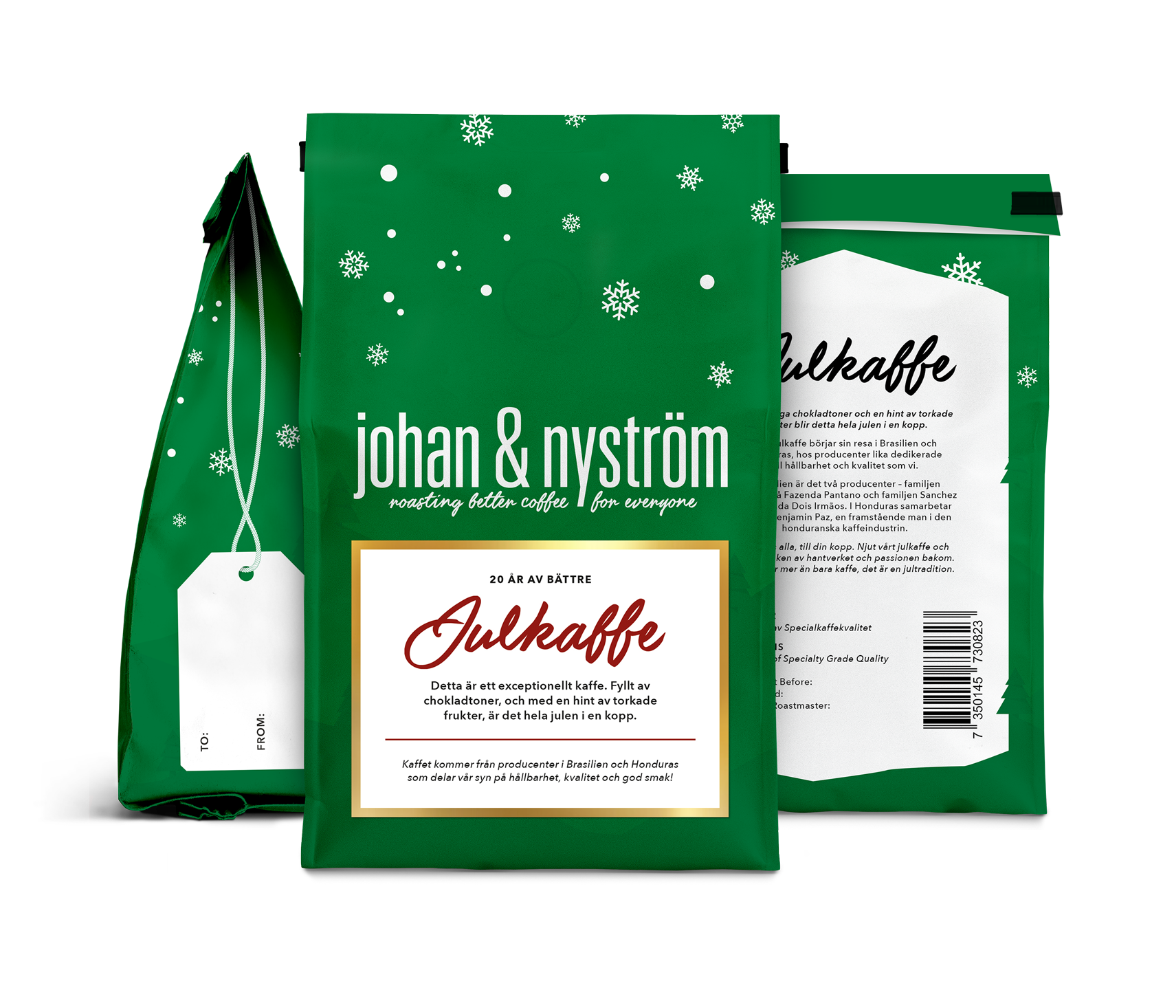 Rostningsdatum 3/10 eller färskare Godast före 3/4 2026OBS BRYGGMALET KAFFE (om du hellre vill ha julkaffe hela bönor, klicka här)Julkaffe 2025 – Från Santa Barbara till Cerrado MineiroBakom årets julkaffe står några av våra mest hängivna producenter – människor som med passion, tålamod och kunskap skapar kaffe som verkligen känns.Benjamin Paz odlar sitt kaffe högt uppe bland dimhöljda berg i Santa Barbara, Honduras. Här ger det svala mikroklimatet och den långsamma mognaden ett kaffe med en naturlig sötma och balans. På sina egna gårdar arbetar han med exklusiva varieteter som Geisha och SL28, samtidigt som han stöttar småskaliga odlare genom familjens processtation Beneficio San Vicente – en central kraft i att sätta Santa Barbara på världskartan för specialkaffe.Från Brasilien kommer bidraget från två familjer med generationer av erfarenhet och djup kärlek till sitt hantverk.Familjen Sanchez driver gården Fazenda Dois Irmãos i Cerrado Mineiro – ett föredöme för hållbart och regenerativt jordbruk. Under ledning av dottern Maria Gabriela kombineras traditionella metoder med modern innovation, alltid med fokus på kvalitet och spårbarhet.Familjen Naimeg, verksamma i samma region, har odlat kaffe i snart 60 år. Efter att ha återuppbyggt sin verksamhet från grunden har de skapat en modell av självförsörjning, där solenergi, egen gödselproduktion och genuin dedikation till gårdens kretslopp står i centrum.Årets julkaffe är en hyllning till dessa människor och deras arbete. Ett kaffe som förenar söta toner av mogna bär och choklad med den värme, omtanke och tradition som hör julen till.Från oss alla – till din kopp.Det här är mer än bara kaffe. Det är hantverk, passion och jultradition i varje droppe.