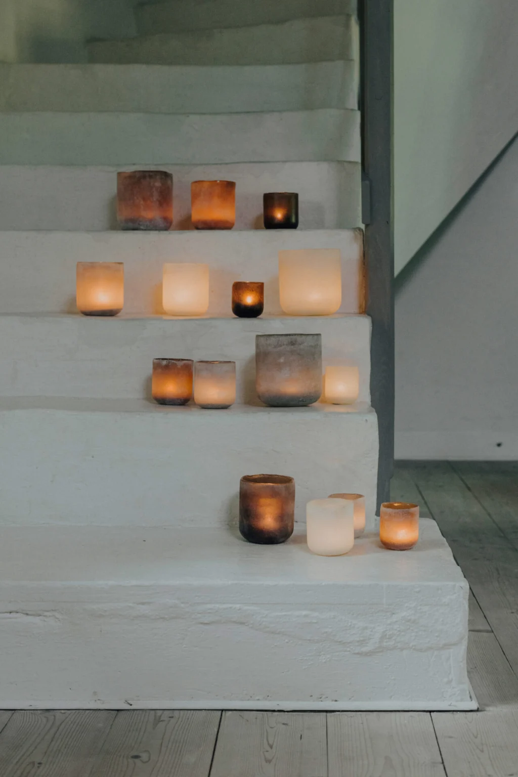 Vacker handgjord ljuslykta i frostat glas med en organiskt formad kant upptill. Varje lykta är unik och ger ett varmt, ombonat och behagligt ljus. Finns i flera färger och storlekar.MATERIAL GlasMÅTT Ø:7,5, H:8 cmSKÖTSELRÅD Ska ej komma i kontakt med fukt och bör ej stå direkt på trä