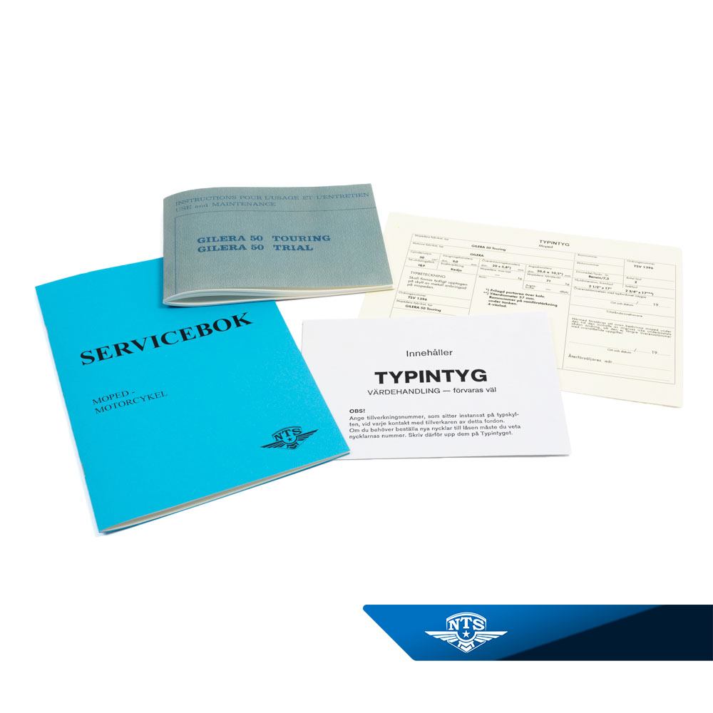 Produkten passar tillGileraTouringTrialGilera Touring TSV 1396Innehåller:Instruktionsbok i högkvalitativt tryck samt garanti och servicehäfte.ServicebokTypintygskopia för modellen, med de specifikationer som gäller från Svensk provningsanstalt, för framförande på allmän väg.Kuvert för förvaring av typintyg samt plastficka i tjockare plast för förvaring av hela dokumentationen.(OBS. Typintygskopian är ingen originalhandling utan endast en onumrerad kopia och bör därmed ses mer som ett datablad, innehållande relevanta data)